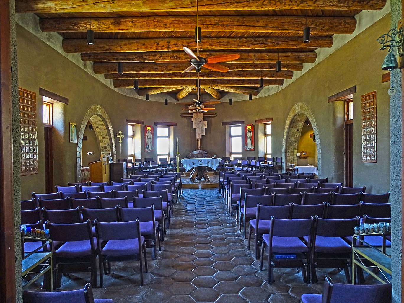 Inside the chapel it was cool which was a relief for me, as it was pushing 100 degrees outside. The ceiling had beautiful hand-hewn Vegas circling the vaulted ceiling. The cross on the pulpit was very unique and beautifully artistic. On the cross was an artist rendition of Jesus with God welcoming Jesus back into heaven… it appeared to be individual paintings or tiles put together in a very artistic way.